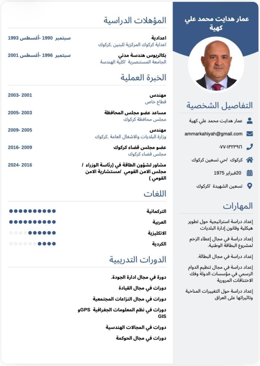 عمار هدايت محمد علي كهية، من مواليد 20 تشرين الأول 1975 في كركوك. مهندس مدني ومستشار لشؤون الطاقة في رئاسة الوزراء ومستشارية الأمن الوطني منذ عام 2016، وعضو مؤسس في أول مجلس محافظة لكركوك عام 2003. أعمل على تمكين المجتمع التركماني عبر مبادرات وطنية تجمع بين الإصلاح الإداري وخدمة المواطنين.